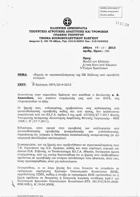 Ο βουλευτής του ΣΥΡΙΖΑ-ΕΚΜ Βαγγέλης Αποστόλου κατέθεσε ως ΑΝΑΦΟΡΑ την από 01.10.2013 επιστολή του Δημάρχου Μαντουδίου - Λίμνης – Αγίας Άννας Εύβοιας με θέμα «Ζημιές στις καλλιέργειες τομάτας και ελιάς», όπου αναφέρεται στα σοβαρά προβλήματα που έχουν προκύψει στους παραγωγούς του Δήμου λόγω της καταστροφής της παραγωγής τομάτας και ελιάς και της απώλειας των κεφαλαίων που διέθεσαν για τις συγκεκριμένες καλλιέργειες