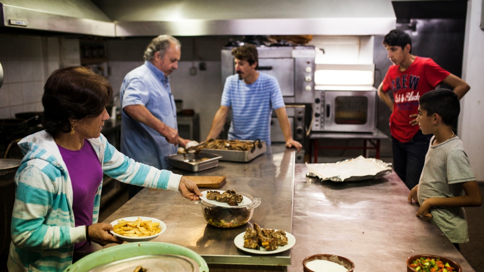| Πρόσφυγες από τη Συρία και προσωπικό της ΜΚΟ "Αλληλεγγύη Τώρα" προετοιμάζει το γεύμα στην κοινόχρηστη κουζίνα του ξενοδοχείου. |